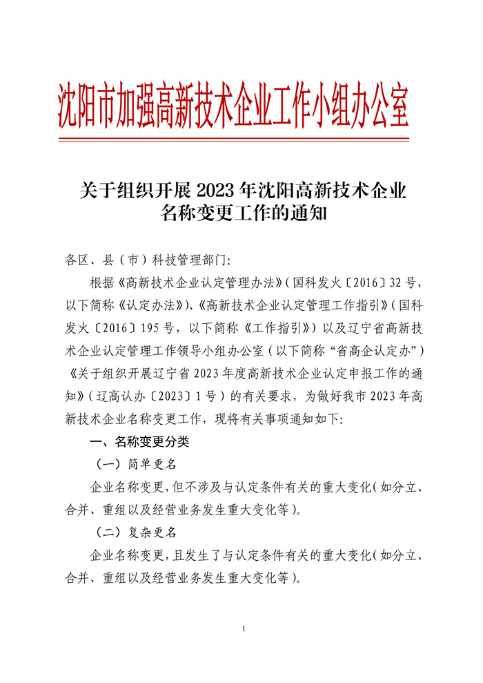 关于组织开展2023年沈阳高新技术企业名称变更工作的通知